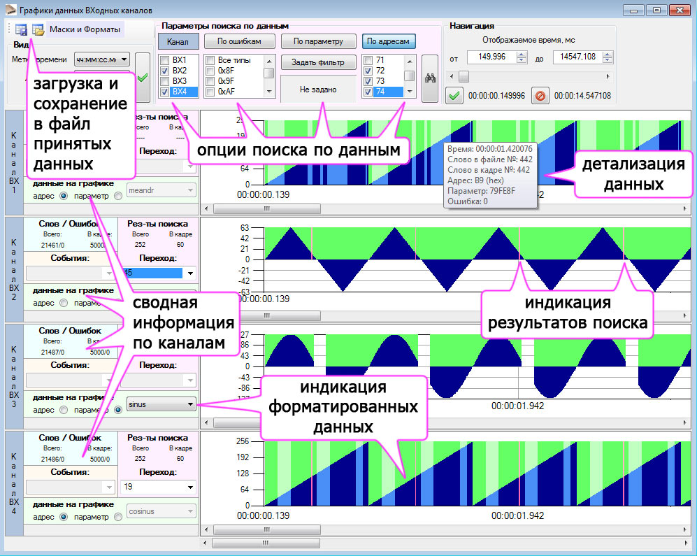 Визуальный контроль принимаемых данных и состояния каналов