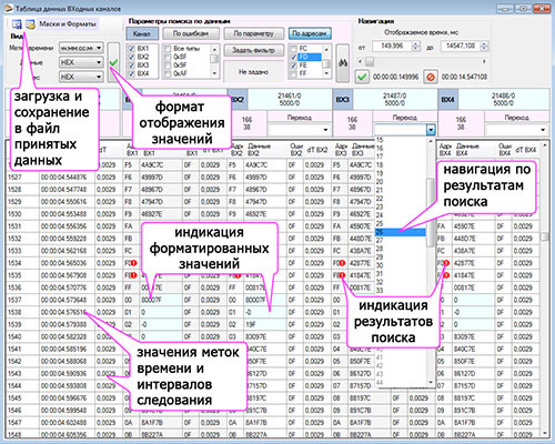 - Поиск в принятых данных по заданным параметрам: